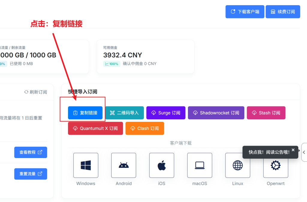 部分机场和服务也支持 一键订阅 功能,直接点击会自动打开 Clash 客户端或跳转导入界面。